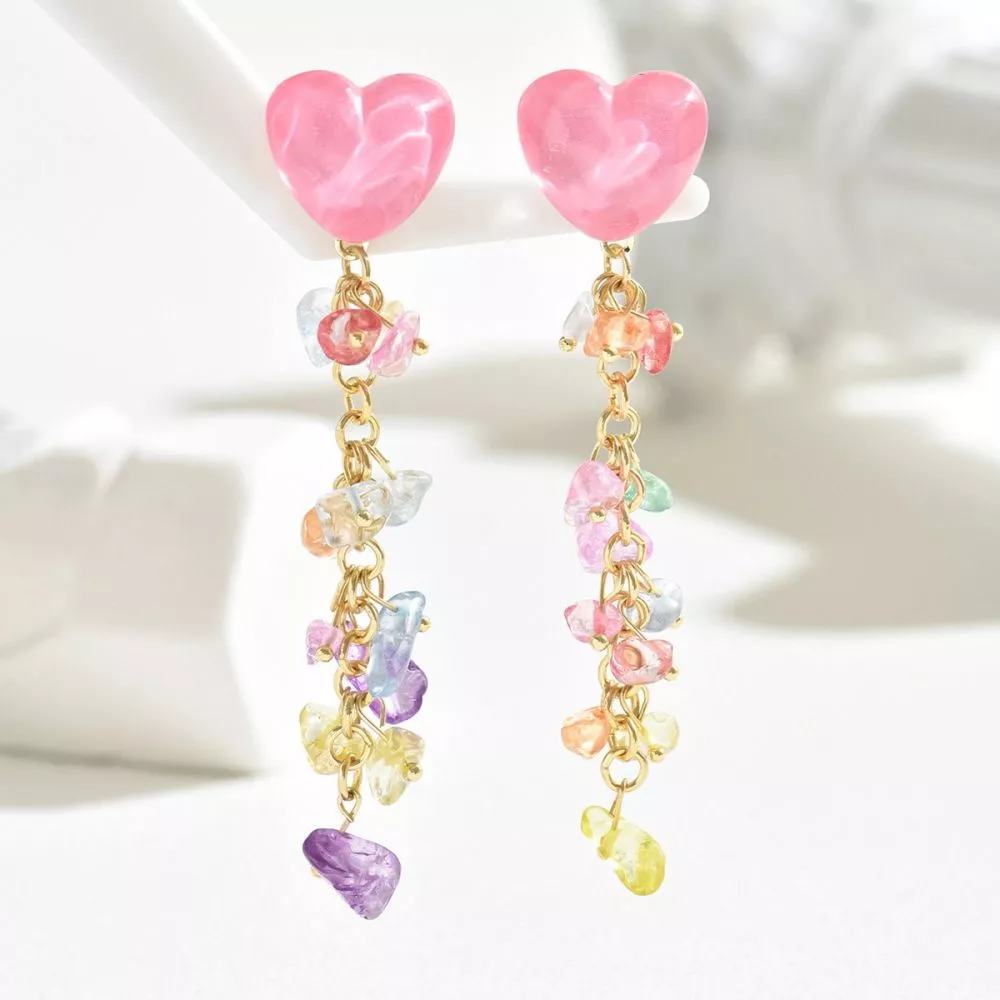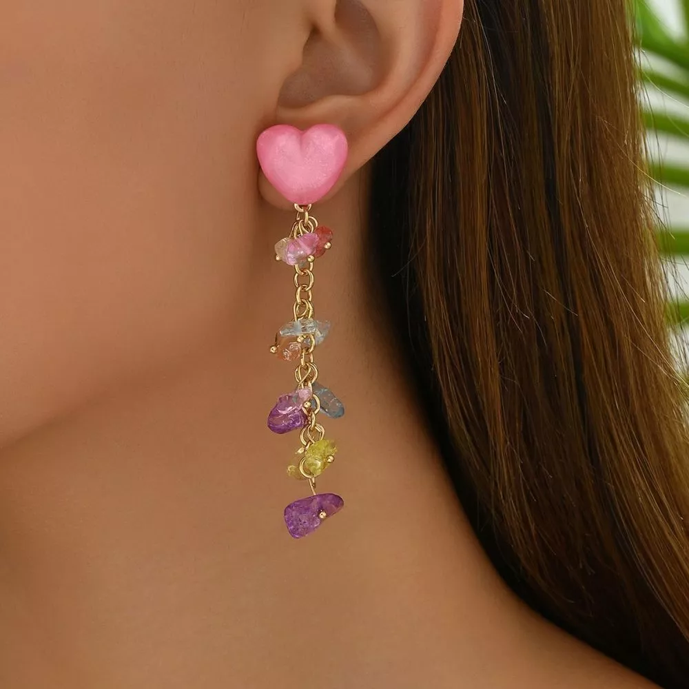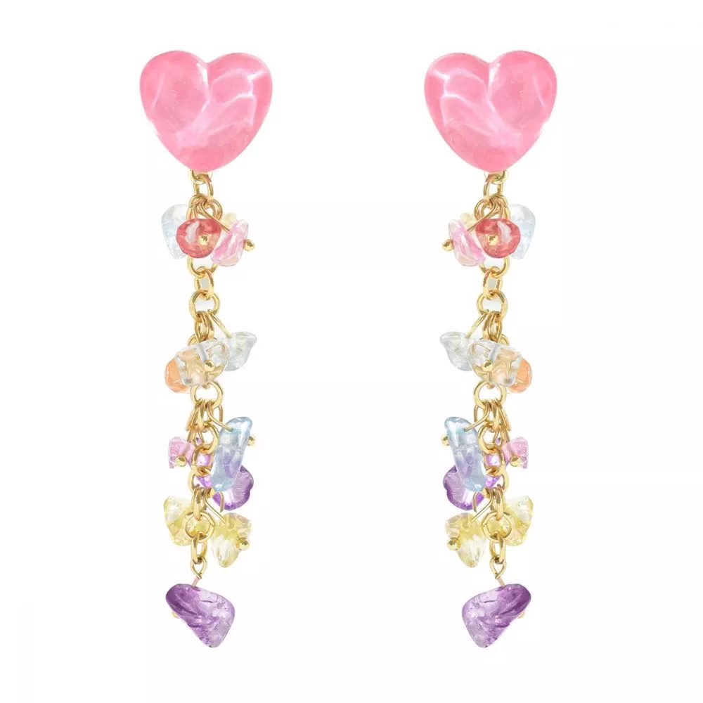 Orecchini pendenti da donna con elemento superiore a forma di cuore in tonalità rosa, abbinato a una catena decorata con pietre multicolore dall’effetto semi-trasparente. Il design combina forme morbide e colori vivaci, creando un’estetica giocosa e contemporanea.