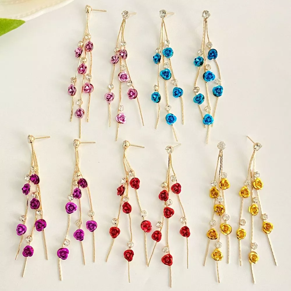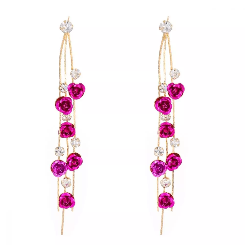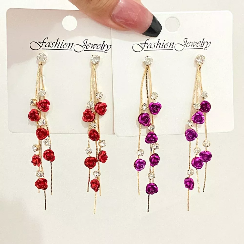 Orecchini lunghi dal design elegante e raffinato, impreziositi da piccoli dettagli a forma di rosa e punti luce che creano un effetto luminoso e sofisticato. La struttura slanciata accompagna il movimento valorizzando il viso con leggerezza e femminilità.