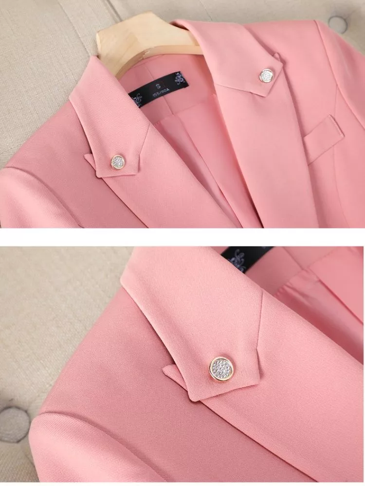 Disponibile in tre tonalità raffinate – nero, rosa pastello e beige – questo tailleur rappresenta la scelta ideale per chi desidera un look elegante, moderno e curato nei dettagli.