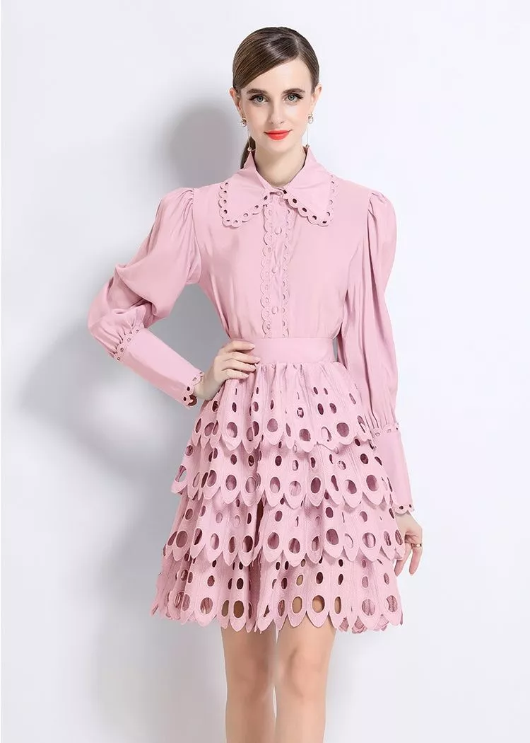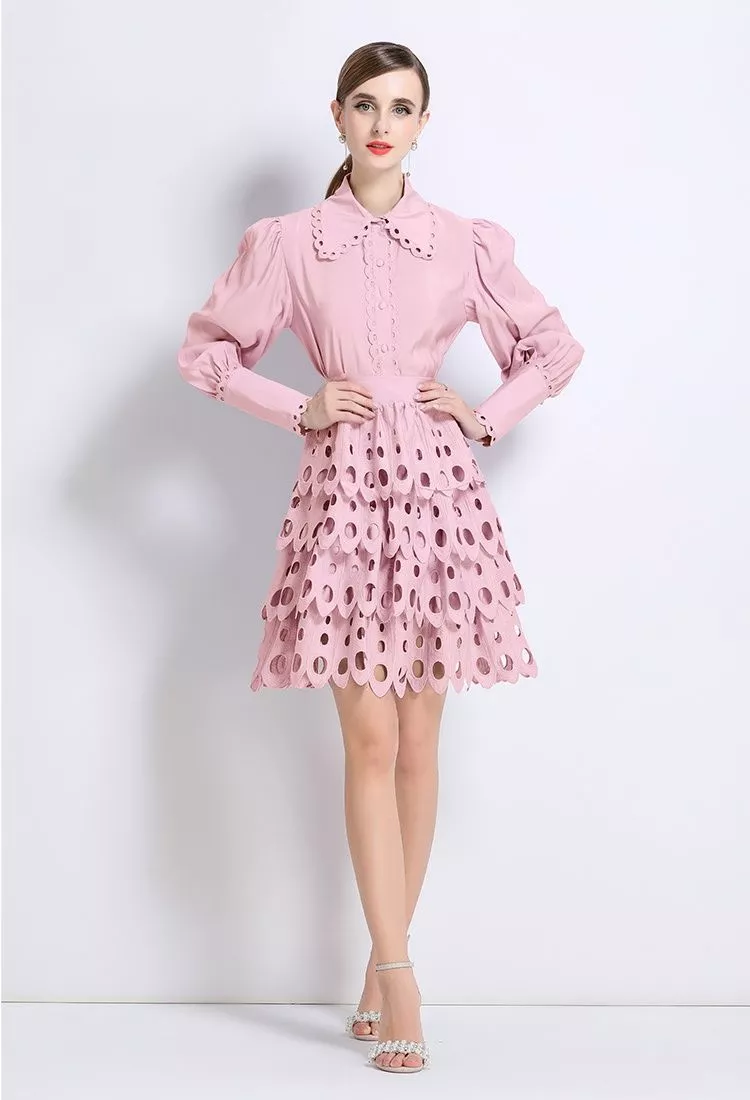 Un set raffinato composto da camicia a maniche lunghe con colletto ricamato e gonna corta a balze in pizzo traforato. La vita segnata slancia la silhouette, mentre i bottoncini frontali e i dettagli ricamati donano un tocco di eleganza retrò. Disponibile in bianco luminoso, porpora sofisticato, arancio rosso vibrante e rosa chiaro romantico, questo outfit è perfetto per cerimonie, serate speciali e occasioni chic.