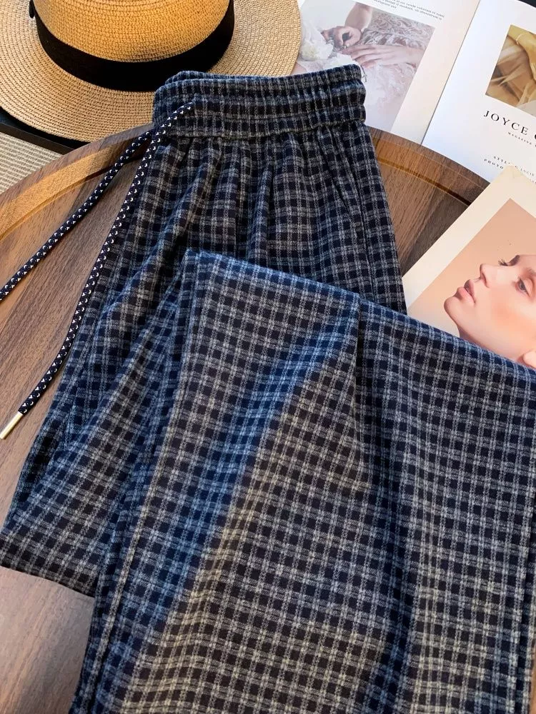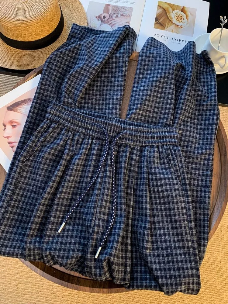 Pantaloni donna modello palazzo con fantasia a quadri blu navy, perfetti per un look casual elegante e contemporaneo. La vita elasticizzata con laccetto regolabile garantisce comfort e vestibilità adattabile.