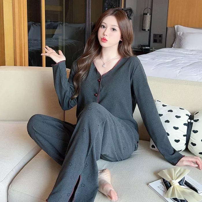Pigiama Donna Completo Set Pantaloni Maglia Blusa Bottoni Grigio Scuro 30558