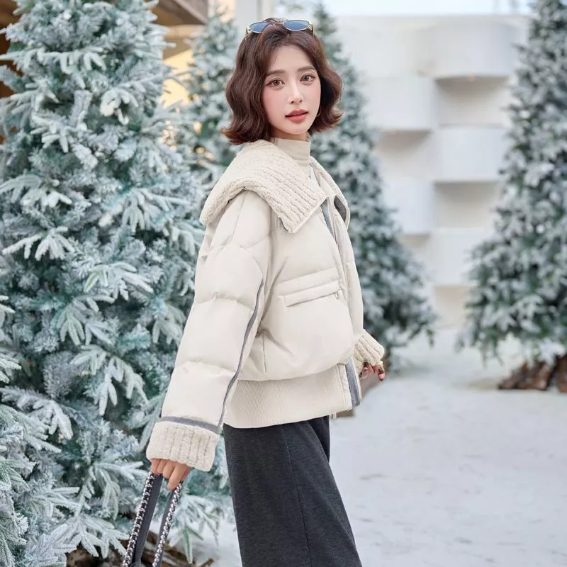 Giacca Corta Donna Beige Imbottita Con Collo Ampio A Contrasto E Zip CF61650