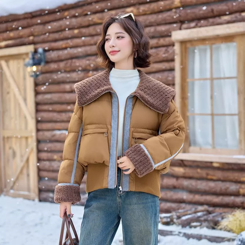 Giacca Corta Donna Marrone Imbottita Con Collo Ampio A Contrasto E Zip CF61650