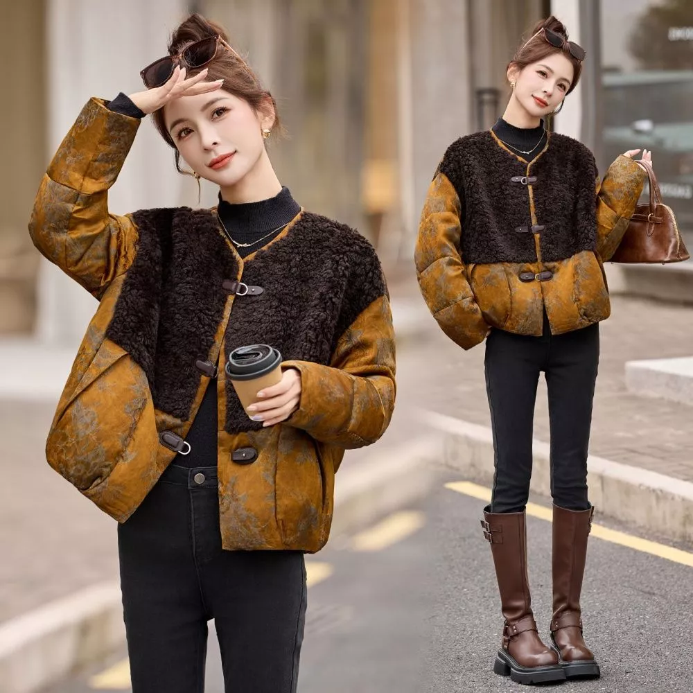 Giacca Donna Imbottita Jacquard Marrone Pelo Bottoni Retro Casual CF66008