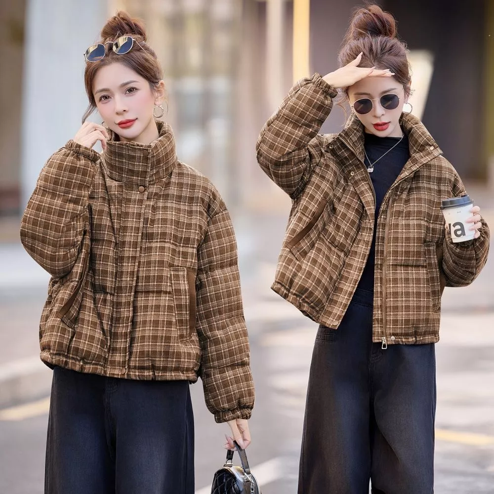 Giacca Corta Imbottita A Quadri Donna Con Collo Alto Morbida Marrone CF66014
