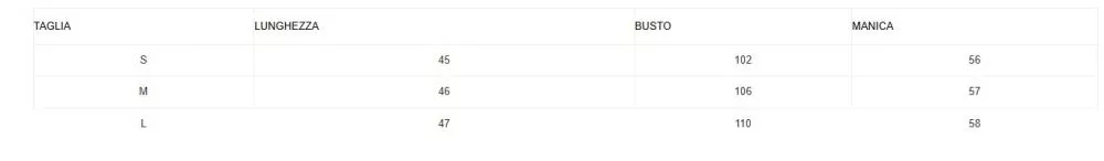 | TAGLIA | LUNGHEZZA | BUSTO | MANICA |