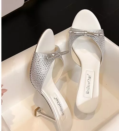 Sabot donna elegante con tacco 8 cm e fascia impreziosita da strass luminosi. Il design open toe valorizza il piede con una linea femminile e sensuale, mentre il fiocco metallico applicato dona un dettaglio sofisticato e scenografico.