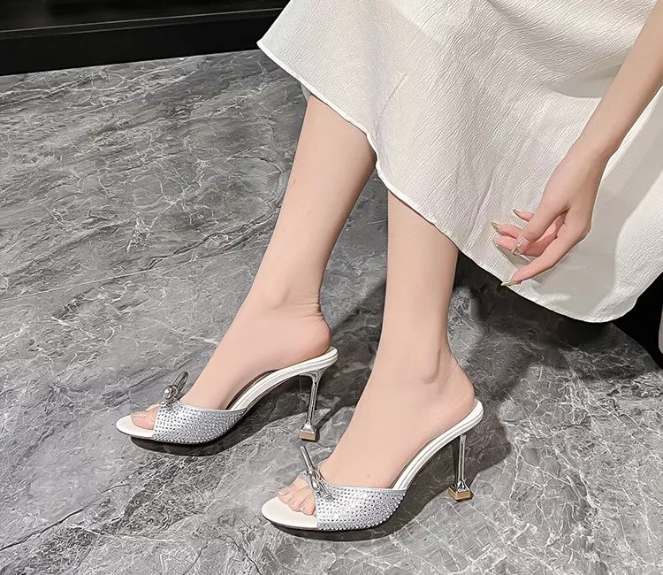 Sabot Donna Eleganti Con Strass E Fiocco Tacco 8 Cm Argento CF68139