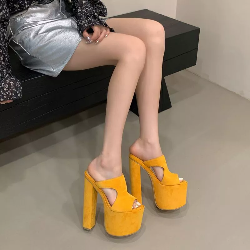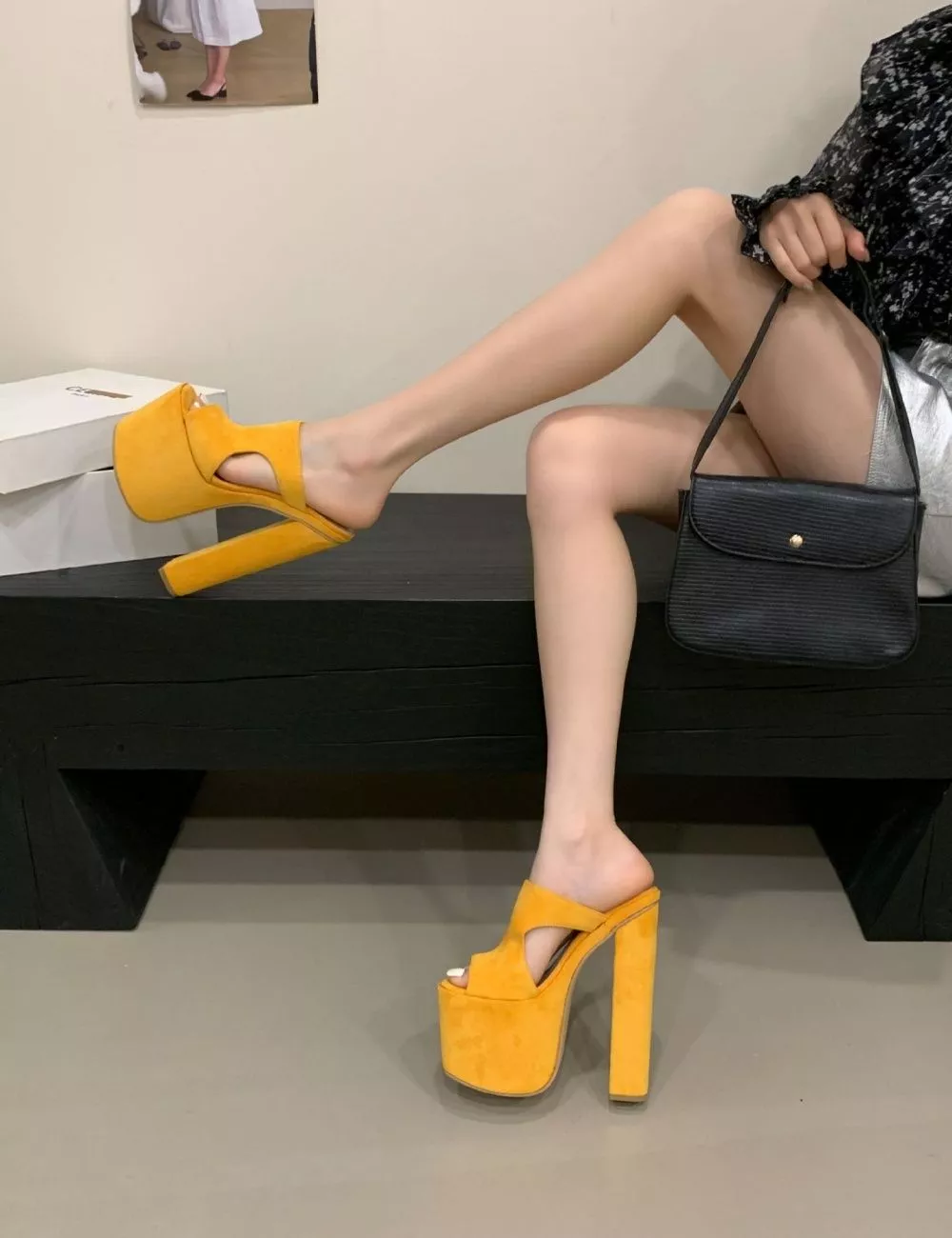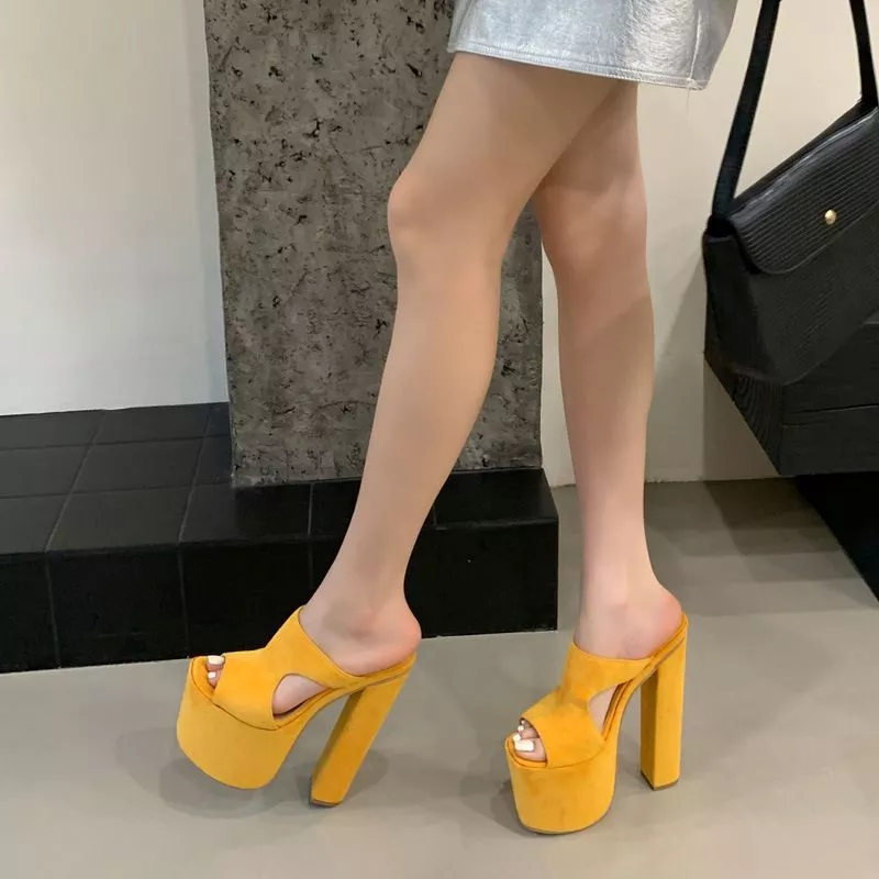 Sabot scenografici pensati per slanciare la figura con un design moderno e ultra femminile. Il colore giallo intenso dona carattere e valorizza ogni outfit, mentre il plateau importante assicura stabilità pur mantenendo un tacco molto alto, ideale per chi cerca un look d’impatto. La linea avvolgente sostiene il piede con eleganza e crea un effetto visivo allungante, perfetto per serate, eventi e combinazioni di stile glamour. La struttura in materiale sintetico offre un aspetto morbido e raffinato, rendendo questi sabot un accessorio di tendenza che illumina la silhouette con personalità.