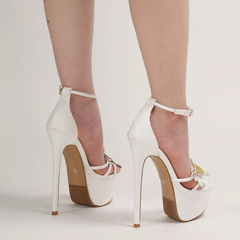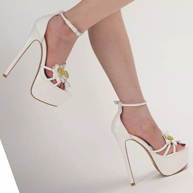 Sandali bianchi in pelle sintetica con plateau alto 16 cm, pensati per un look elegante e scenografico. Il fiore applicato sul davanti dona un tocco romantico e luminoso, ideale per outfit da cerimonia, serate importanti e shooting fashion. Il tacco molto alto slancia la figura, mentre il platform garantisce maggiore stabilità e una camminata sicura. Il design valorizza il piede con linee sottili e femminili, perfetto per chi desidera un modello raffinato ma d’impatto, capace di completare qualsiasi look elegante con personalità.