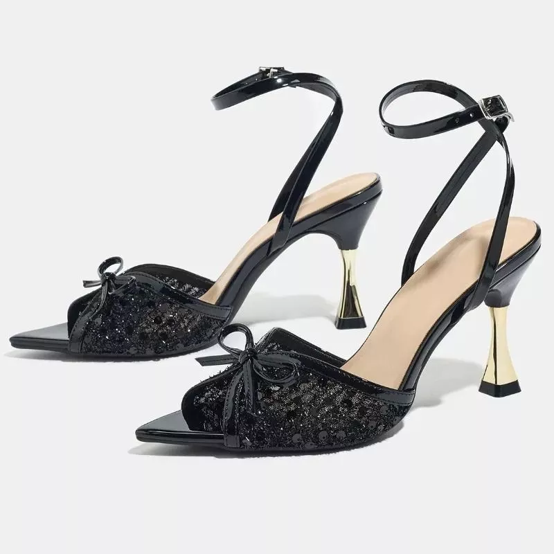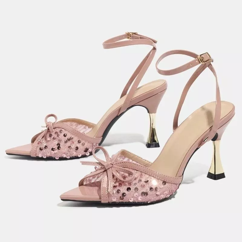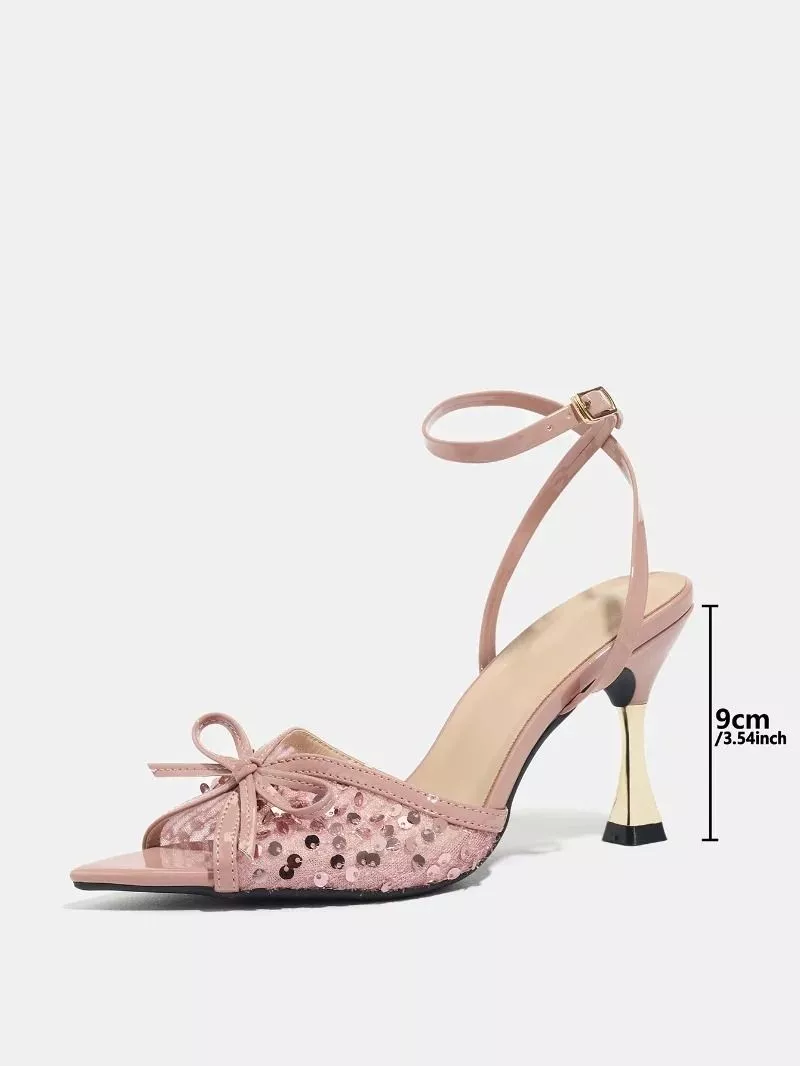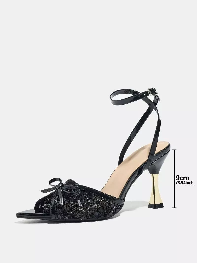 Sandali con tacco da 9 cm dal design elegante e luminoso, caratterizzati da punta aperta e inserto frontale glitterato che riflette la luce e dona movimento alla scarpa. Il dettaglio con fiocco aggiunge un elemento decorativo delicato, mantenendo un equilibrio tra stile raffinato e visibilità.