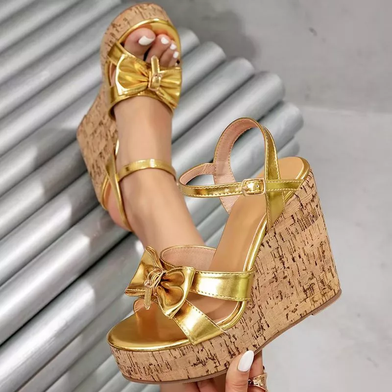 Sandali Oro Con Plateau In Sughero Da 12 Cm Con Fiocco Eleganti Estivi CF54950
