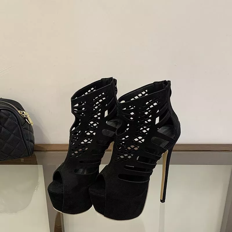 Il colore nero rende questo modello estremamente versatile, perfetto per look da sera, eventi, feste o occasioni speciali in cui si desidera un impatto forte e femminile. La linea audace e la lavorazione traforata valorizzano la gamba, trasformando questi sandali in un vero protagonista dell'outfit.