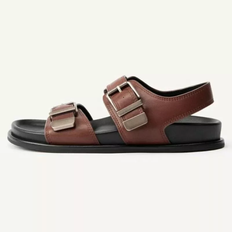 Sandali bassi dal carattere deciso, costruiti con doppia fascia ampia e maxi fibbie metalliche che definiscono un'estetica contemporanea e strutturata. Il design pulito ma incisivo li rende facilmente riconoscibili e ad alto impatto visivo, senza risultare eccessivi.