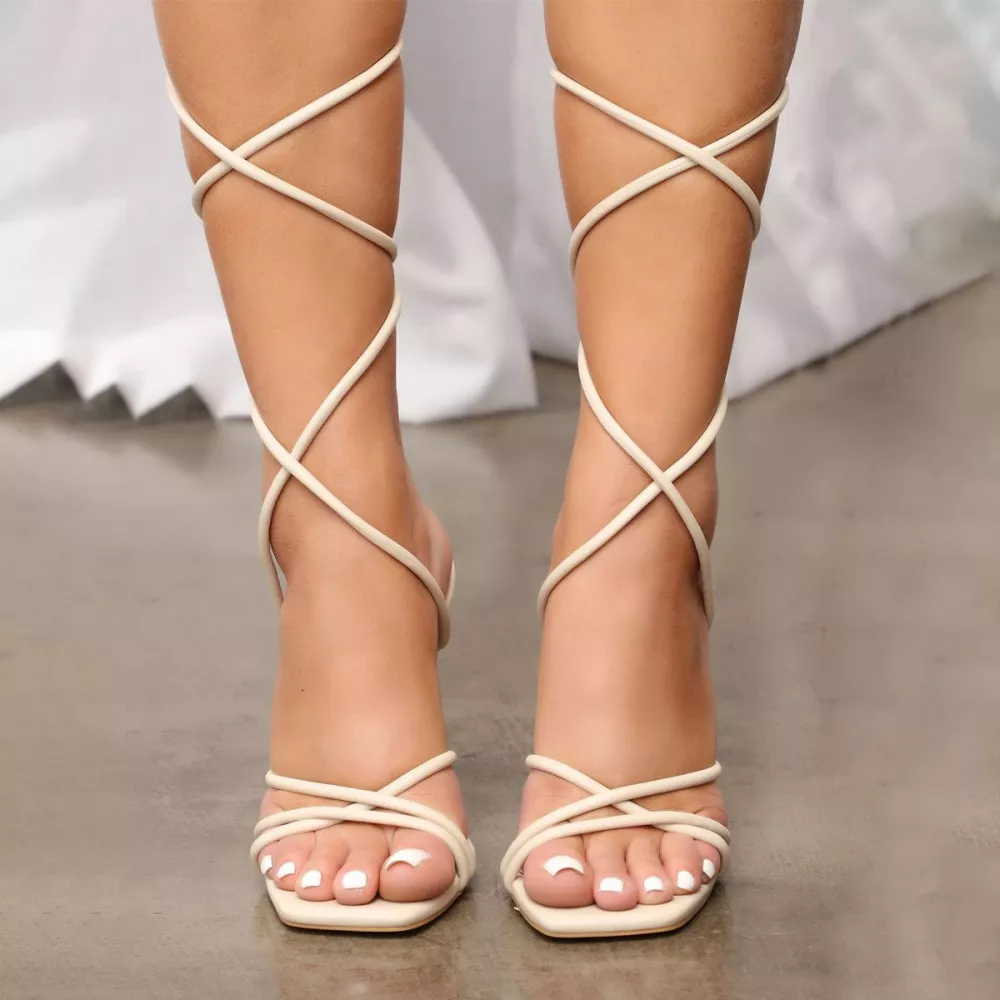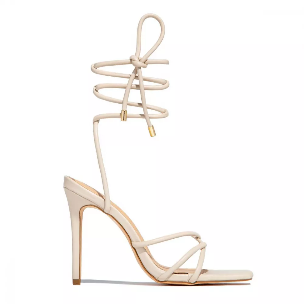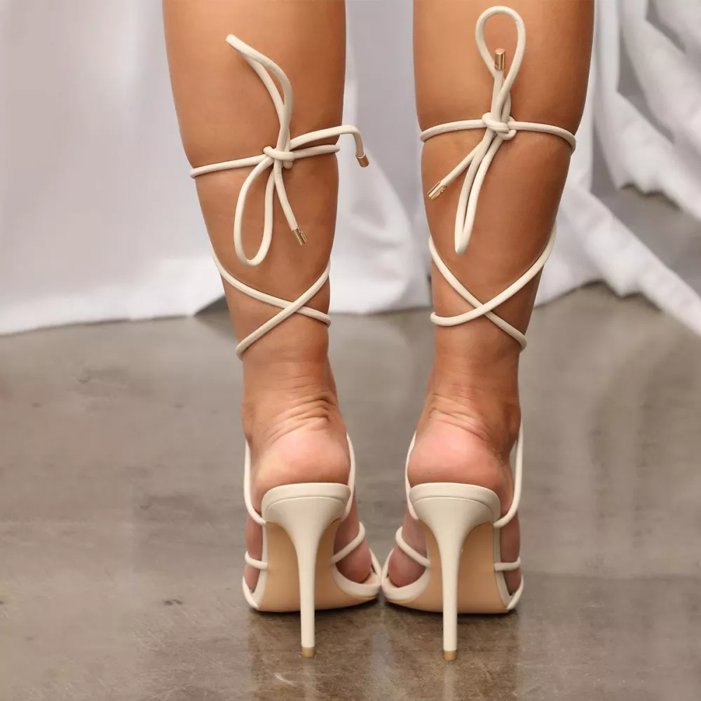 Sandali donna tacco alto 10 cm stiletto beige lacci schiava pelle sintetica D192