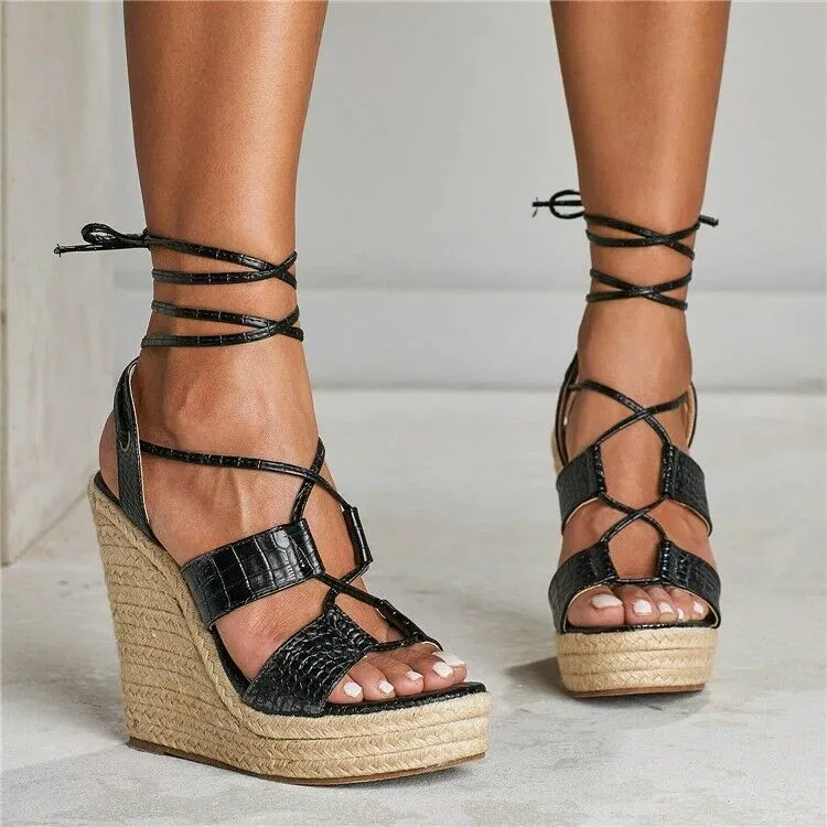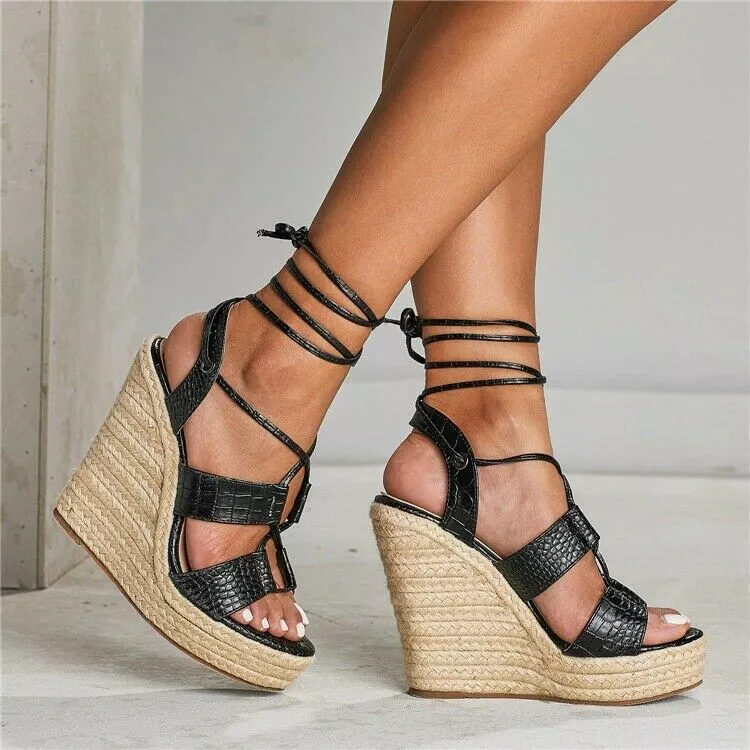 sandali donna zeppa 13 Platform nero beige corda pelle sintetica lacci CZ158