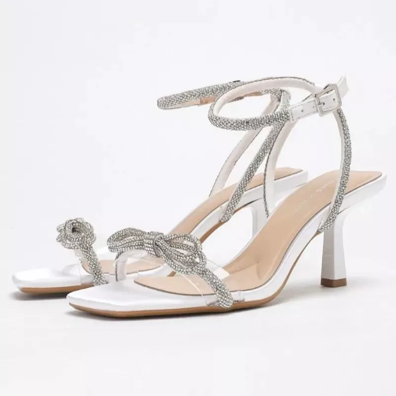 Sandali eleganti dal design raffinato e luminoso, pensati per valorizzare il piede con una struttura leggera e dettagli decorativi brillanti. I sottili cinturini arricchiti da strass creano un effetto visivo delicato ma d’impatto, ideale per completare outfit da sera o da cerimonia.