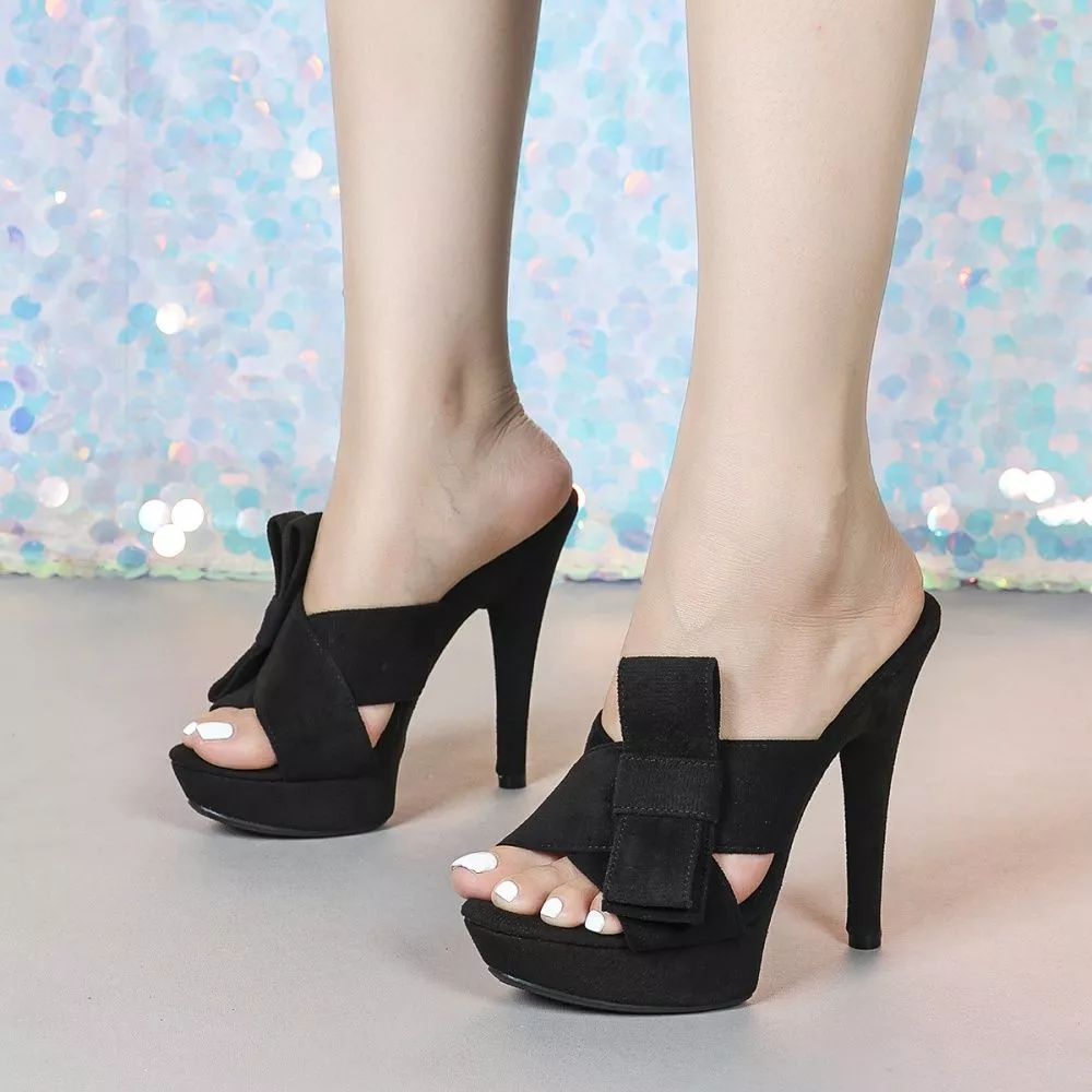 Sandali mules con plateau e tacco alto in pelle sintetica effetto scamosciato, impreziositi da un maxi fiocco frontale che dona eleganza e un tocco glam. Il design slanciato allunga la silhouette, rendendoli ideali per eventi, serate o cerimonie. Perfetti da abbinare a vestiti longuette, abiti da sera o outfit eleganti.