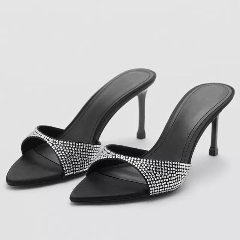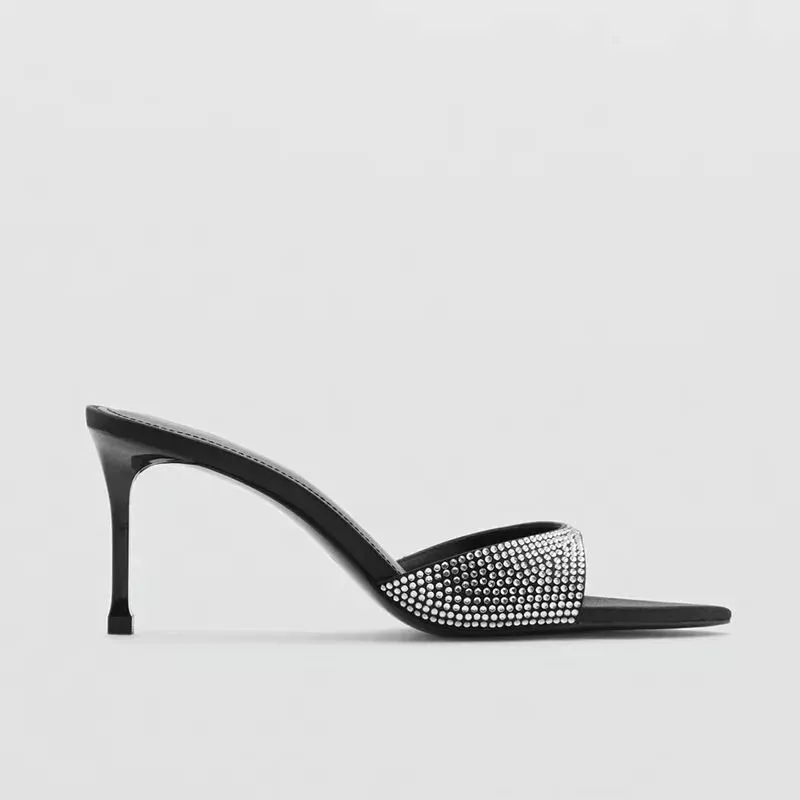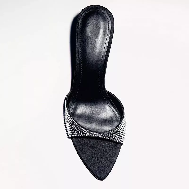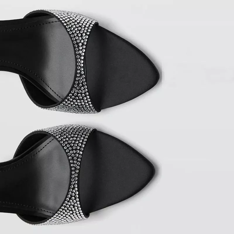 Sandali Neri Donna Tacco 7 Cm Mule Con Strass Scarpe Sera Moda Chic Glam J5X9C7