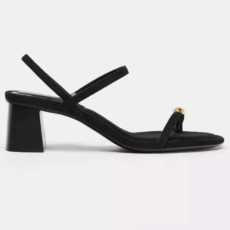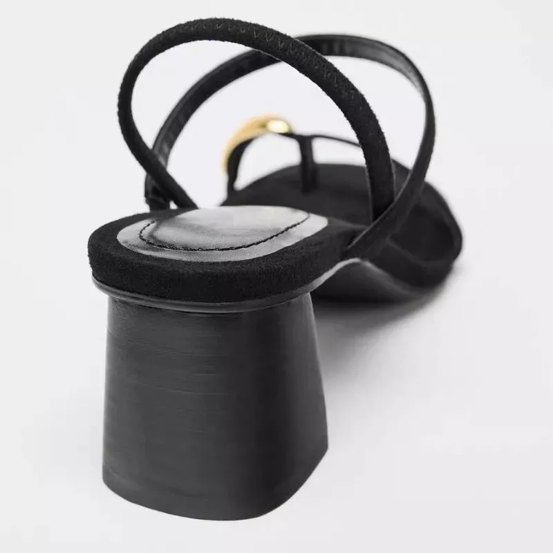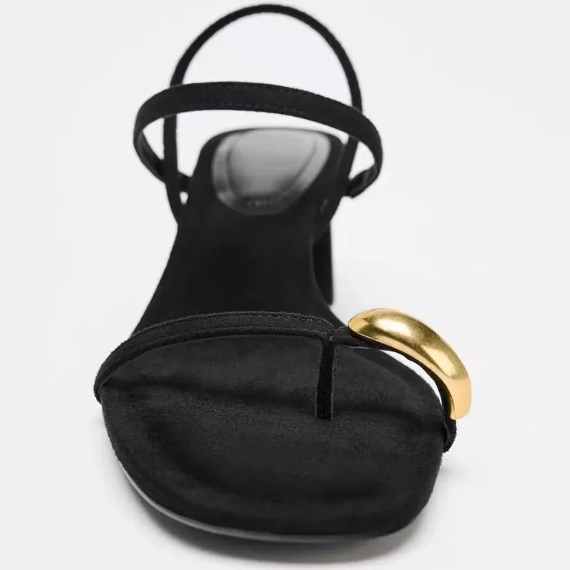 Sandali dal design essenziale ma altamente distintivo, pensati per chi cerca un equilibrio preciso tra eleganza minimale e dettagli di carattere. La struttura pulita in nero viene valorizzata da un elemento decorativo dorato che cattura l'attenzione senza risultare eccessivo, creando un punto focale sofisticato.
