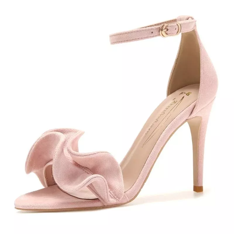Sandali con tacco alto da 10 cm realizzati in velluto, caratterizzati da un dettaglio frontale con volant che crea movimento e volume, aggiungendo un tocco raffinato e femminile. Il cinturino alla caviglia garantisce stabilità e definisce la linea della scarpa.