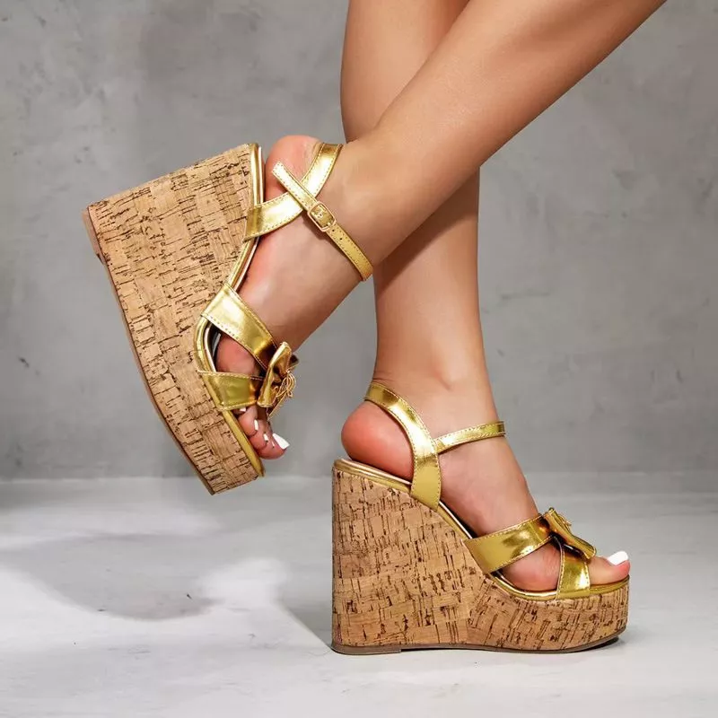 Sandali oro con zeppa in sughero alta 12 cm, caratterizzati da un design luminoso e moderno con maxi fiocco frontale che dona un tocco chic e femminile.