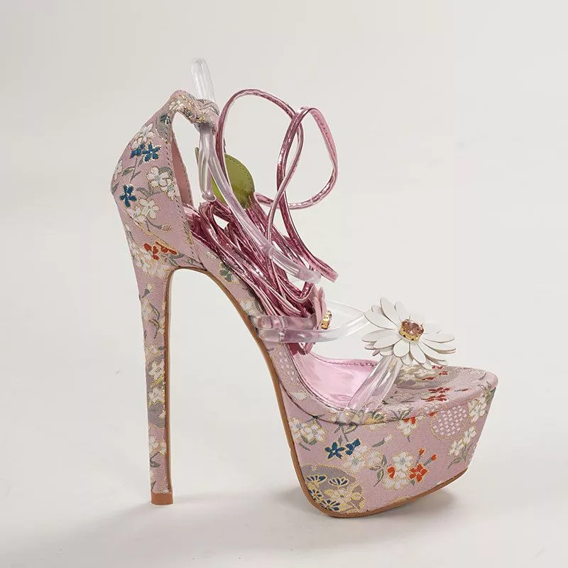 Sandali con plateau estremamente alti, pensati per un look scenografico e femminile. La base rivestita in fantasia floreale dona un effetto ricercato, mentre i lacci avvolgenti slanciano la gamba e valorizzano la silhouette. Le applicazioni a fiore con dettaglio luminoso aggiungono un tocco elegante e raffinato, ideale per serate, eventi e outfit di forte impatto visivo. La suola alta con plateau da 6 cm rende il tacco più stabile, garantendo una camminata più equilibrata. Una calzatura pensata per chi ama distinguersi con stile e sicurezza.