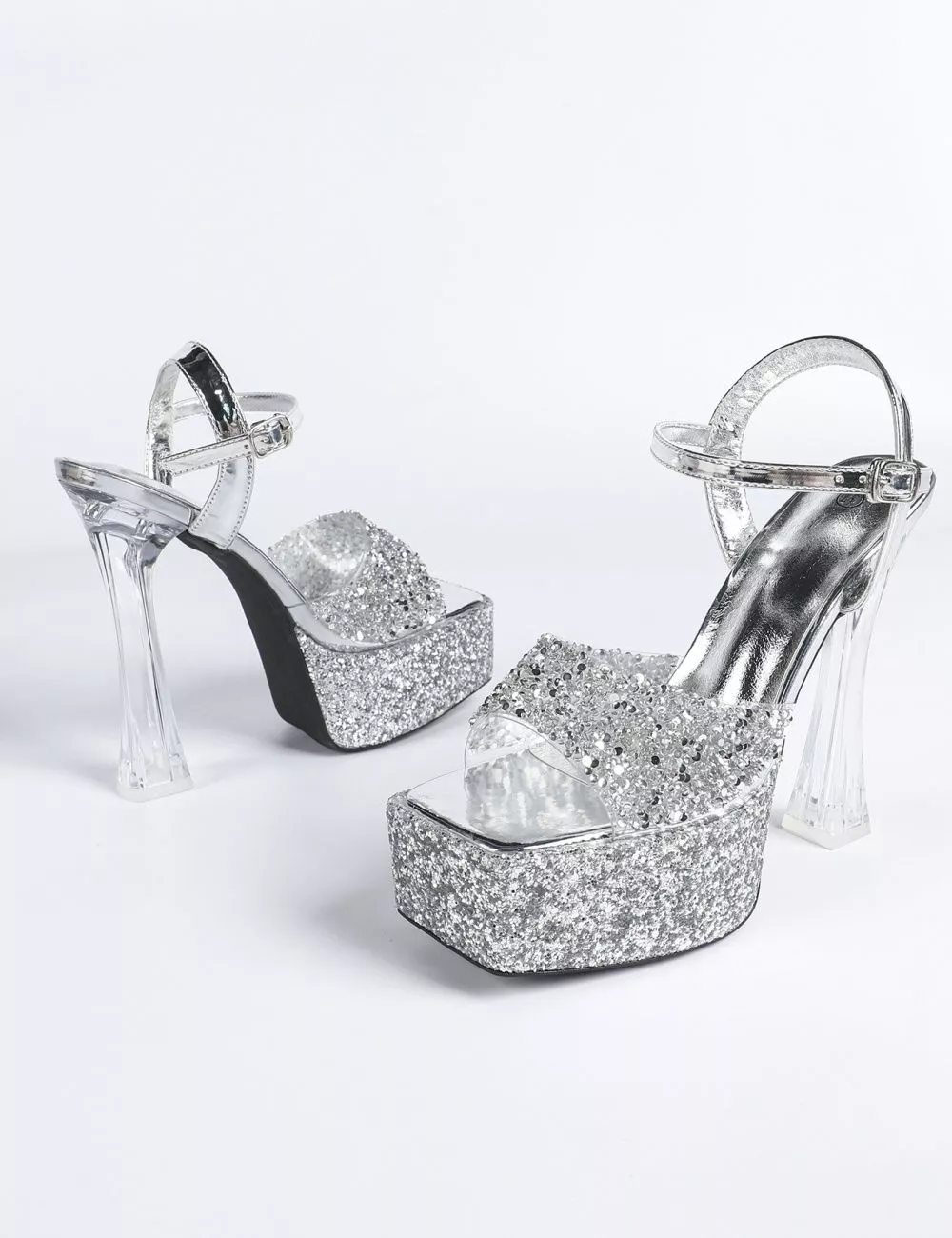 Sandali platform dal design brillante e scenografico perfetti per party, eventi e serate eleganti. Il tacco trasparente slancia la figura con un effetto moderno e glamour, mentre il plateau alto garantisce maggiore stabilità durante la camminata.