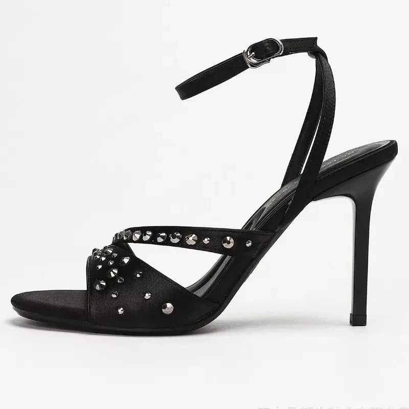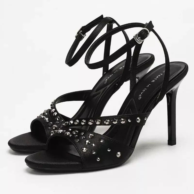 Il tacco alto slanciato dona altezza e valorizza la figura, mentre il cinturino regolabile alla caviglia garantisce una calzata stabile e sicura. La fascia anteriore impreziosita da applicazioni luminose aggiunge un tocco distintivo senza risultare eccessiva.