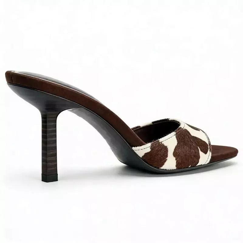 Sandali con tacco alto da 10 cm dal design essenziale ma deciso, pensati per valorizzare la silhouette con una linea pulita e contemporanea. La fascia frontale effetto cavallino dona profondità visiva e carattere, disponibile sia in versione tinta unita per un look più versatile, sia in variante animalier per un impatto più audace.