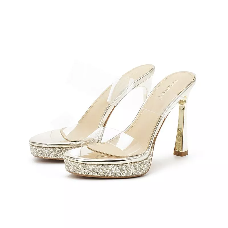 Sandali eleganti con plateau dal design luminoso e sofisticato, perfetti per cerimonie, eventi e serate speciali. Le fasce trasparenti creano un effetto minimal e moderno che slancia la figura, mentre la base glitter dona un tocco glamour e raffinato. Il tacco alto valorizza la silhouette e il plateau anteriore migliora comfort e stabilità, rendendo questo modello ideale per completare outfit da festa, look da sera e abiti eleganti. Un sandalo femminile e scenografico pensato per chi desidera brillare con stile.