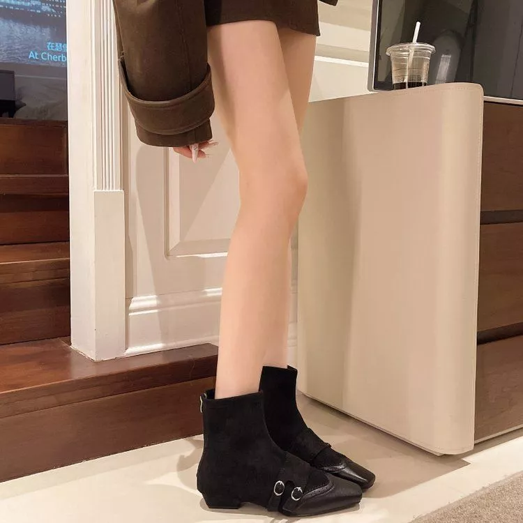 Stivaletti Donna Stile Francese Con Tacco Basso 3 cm E Cinturino Nero CF65392