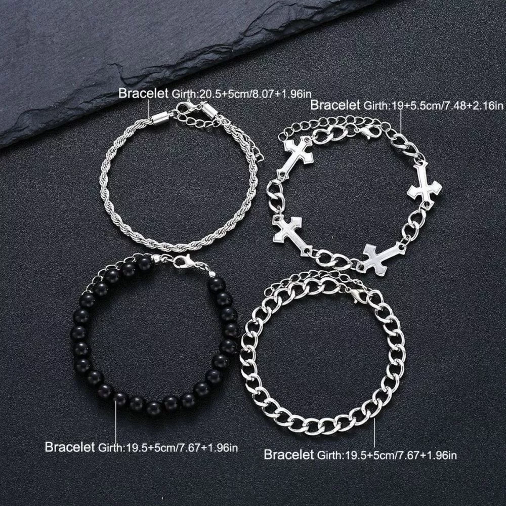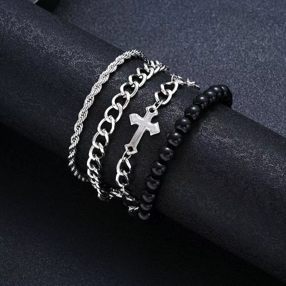 Set composto da 4 bracciali da uomo con combinazione di elementi in argento e nero. Il design include catene, perline e dettagli con croce, creando un’estetica decisa e coerente con uno stile contemporaneo.