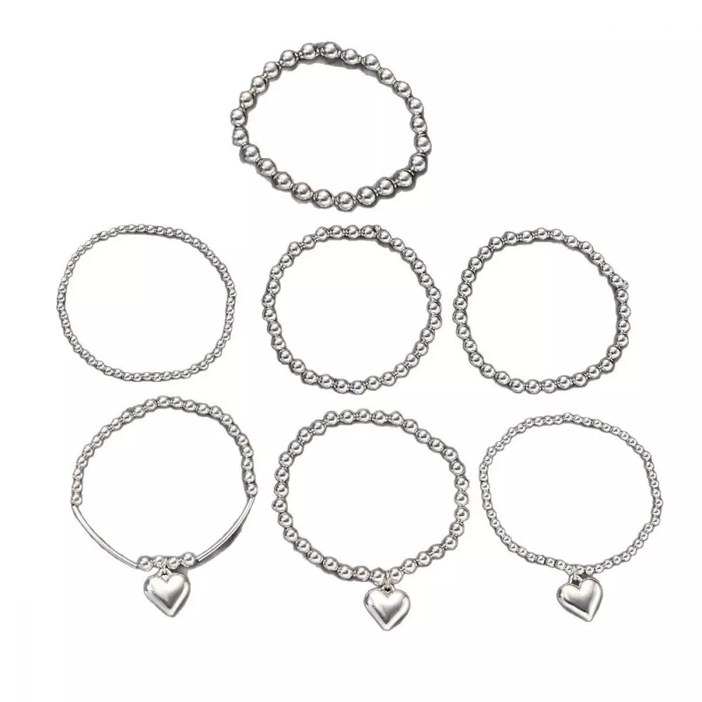 Set composto da 7 braccialetti elasticizzati da donna disponibili nelle varianti oro e argento. Il design combina perline decorative con ciondoli a forma di cuore, creando un effetto visivo luminoso e stratificato.