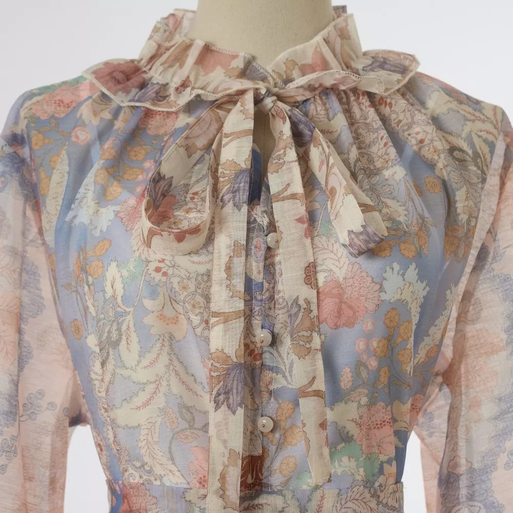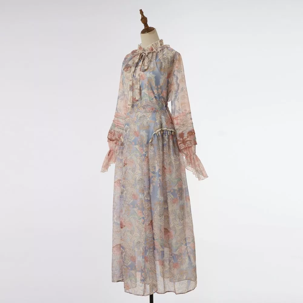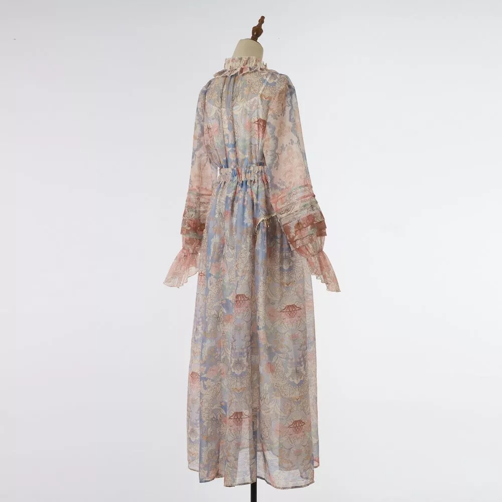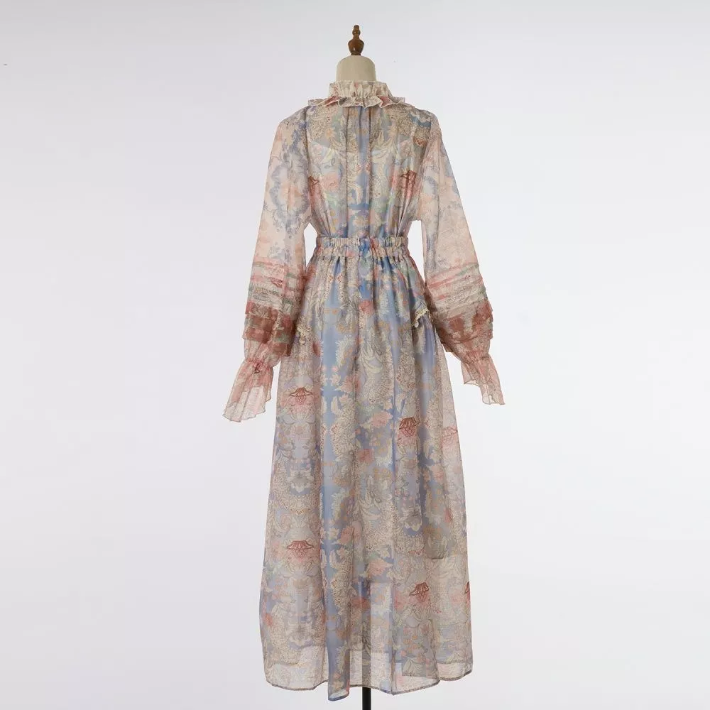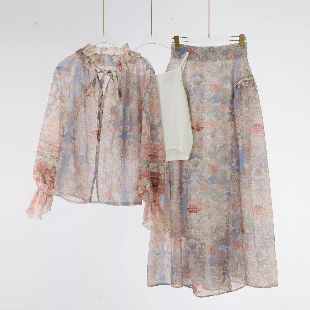 Set raffinato e femminile composto da camicia leggera e gonna lunga coordinata, caratterizzato da una fantasia rosa multicolore dal gusto romantico. La camicia presenta un colletto morbido arricciato con fiocco, maniche trasparenti con balze e una linea fluida che dona leggerezza. La gonna lunga scivola con eleganza e definisce la figura con una silhouette morbida e ariosa, ideale per momenti di vacanza, giornate all’aperto e occasioni diurne. La trasparenza del tessuto crea un effetto leggero e sofisticato, arricchito dalla sottoveste interna che rende il set pratico e versatile.