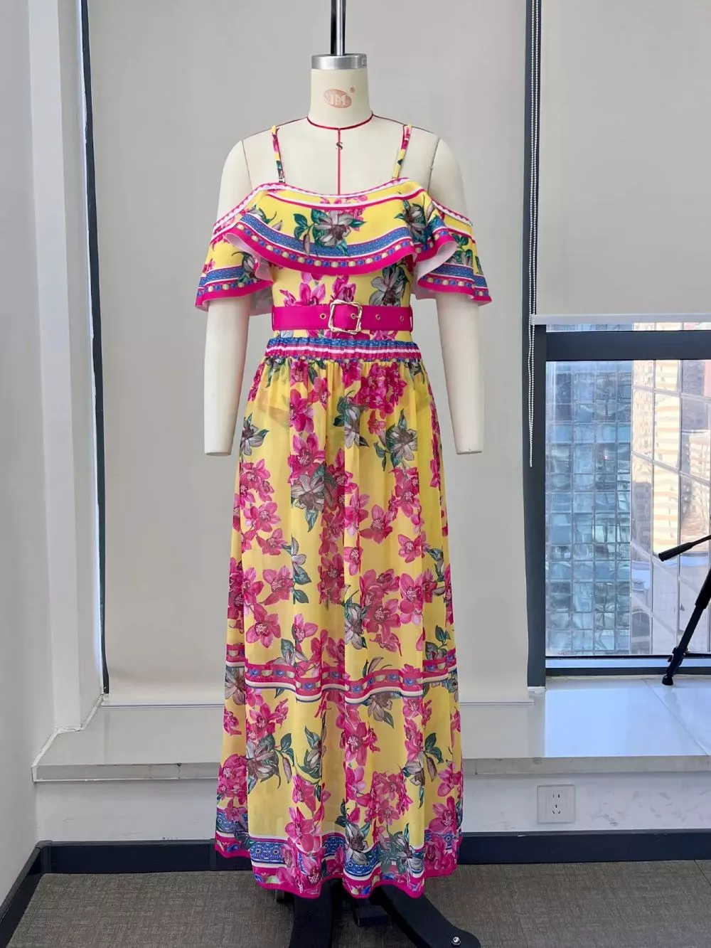 🎨 Colore: Giallo intenso con stampa floreale rosa e verde