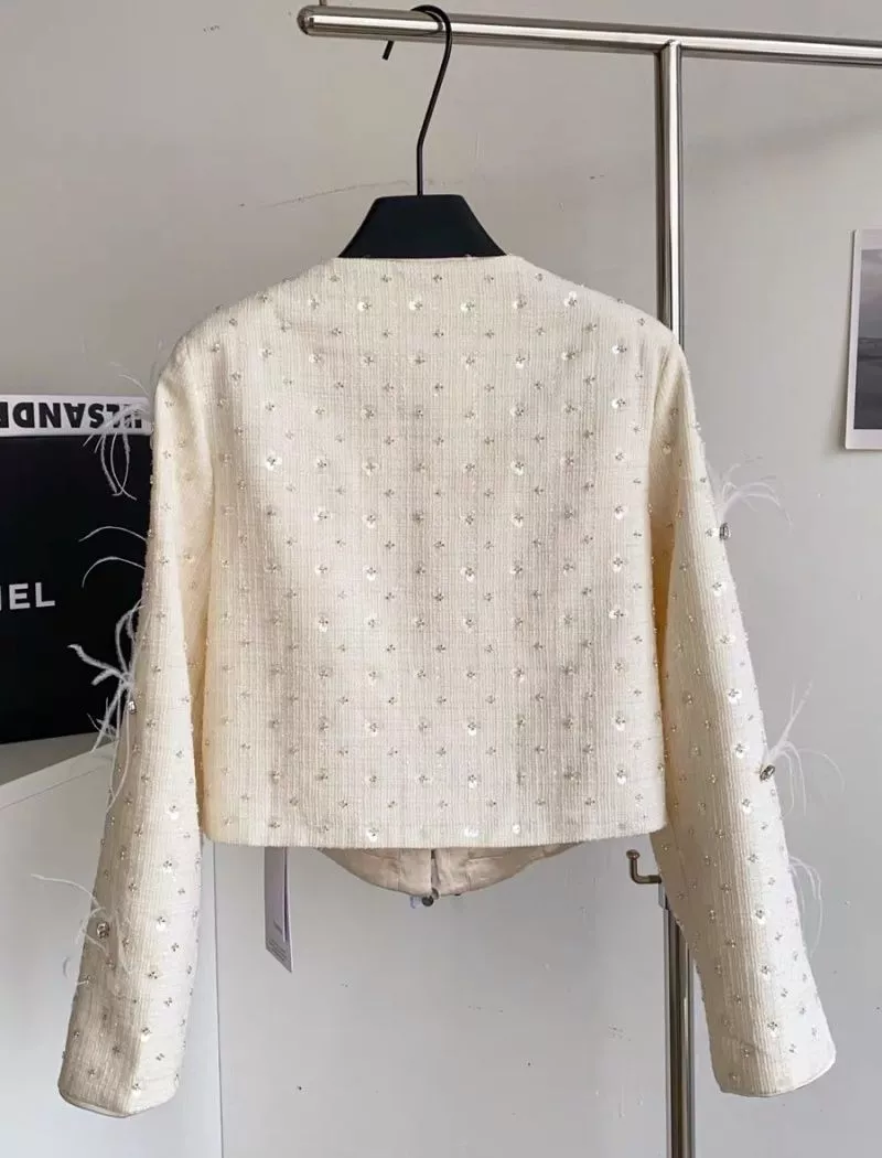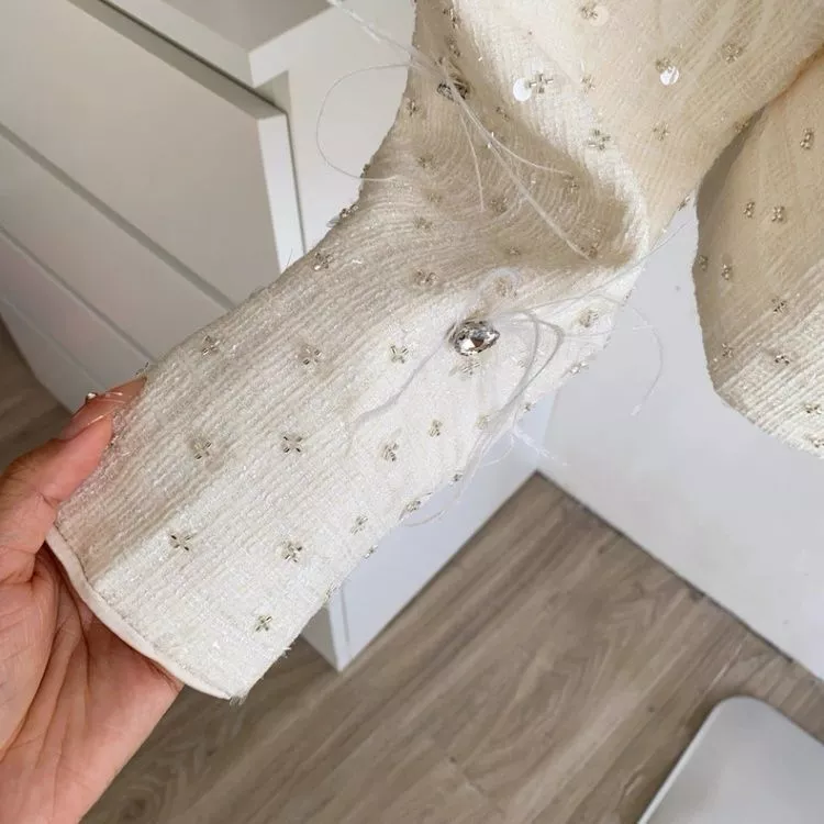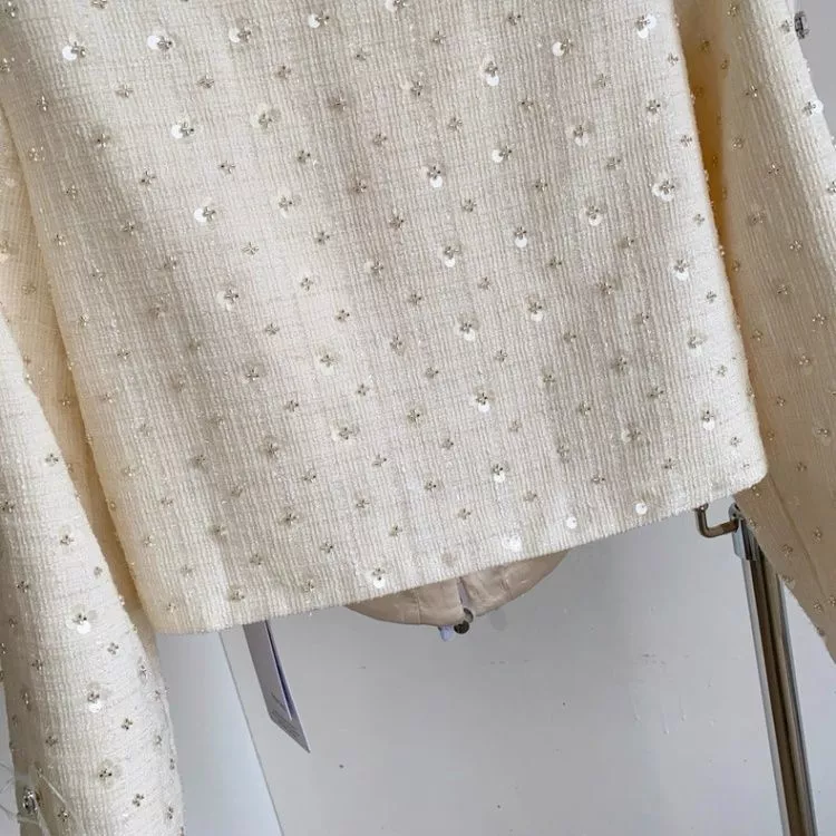 Set due pezzi da donna dallo stile raffinato e femminile, composto da giacca corta coordinata e gonna corta abbinata. Il completo presenta una lavorazione testurizzata elegante, arricchita da applicazioni luminose tipo strass distribuite su tutta la superficie, che donano luce e un effetto ricercato al capo.