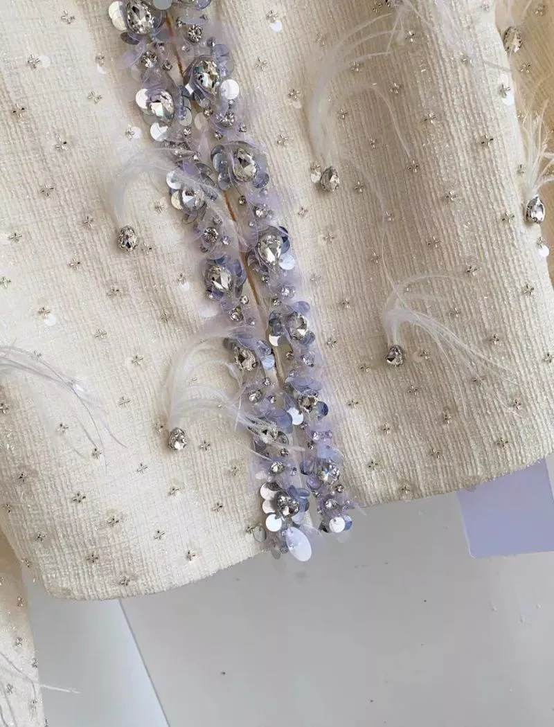 La giacca corta è caratterizzata da una linea pulita con profilo decorato e chiusura centrale impreziosita da dettagli gioiello, mentre la gonna corta coordinata valorizza la silhouette mantenendo un equilibrio tra eleganza e femminilità. Un set ideale per eventi eleganti, cerimonie o occasioni speciali in cui è richiesto un outfit curato e distintivo.