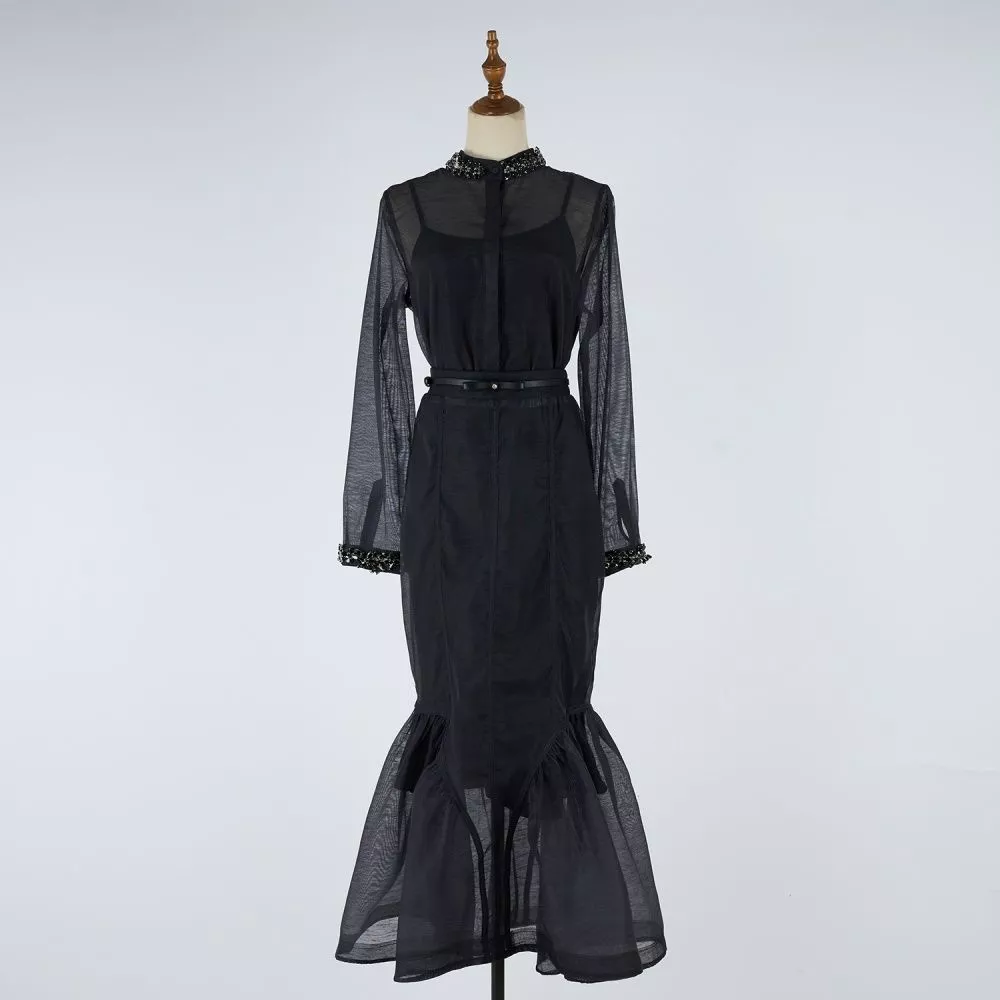 Set femminile elegante composto da camicia semitrasparente con colletto gioiello e polsini decorati, abbinata a una gonna longuette mermaid con balza finale che slancia la figura. Il top interno leggero completa il look e garantisce una vestibilità confortevole. Il design raffinato e i dettagli luminosi rendono questo outfit perfetto per cene, eventi e serate speciali. Un set versatile, moderno e di grande impatto visivo.