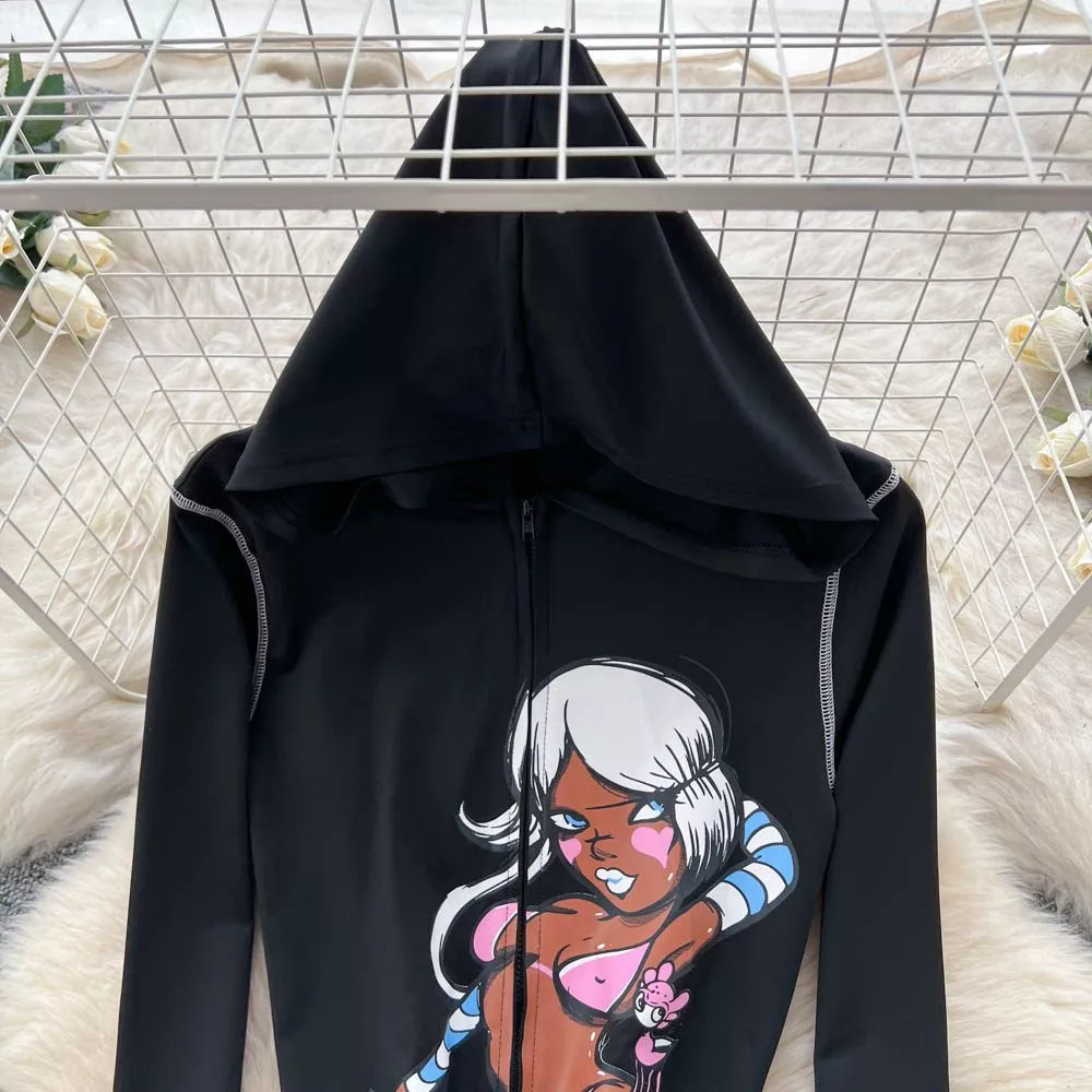Il top cropped presenta una linea aderente con maniche lunghe e cappuccio integrato, arricchito da una stampa grafica centrale che dona carattere al capo. La lunghezza corta bilancia le proporzioni e crea un contrasto moderno con i pantaloni a vita alta.