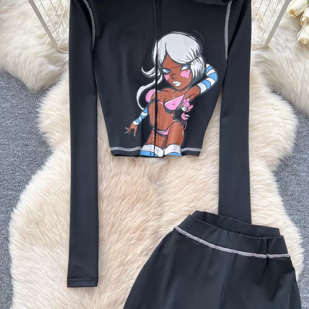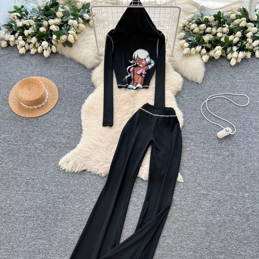 Set donna due pezzi dallo stile urbano e contemporaneo, ideale per chi cerca un look deciso ma confortevole. Il completo è composto da top corto con cappuccio e pantaloni lunghi a vita alta, pensati per valorizzare la silhouette senza rinunciare alla praticità.