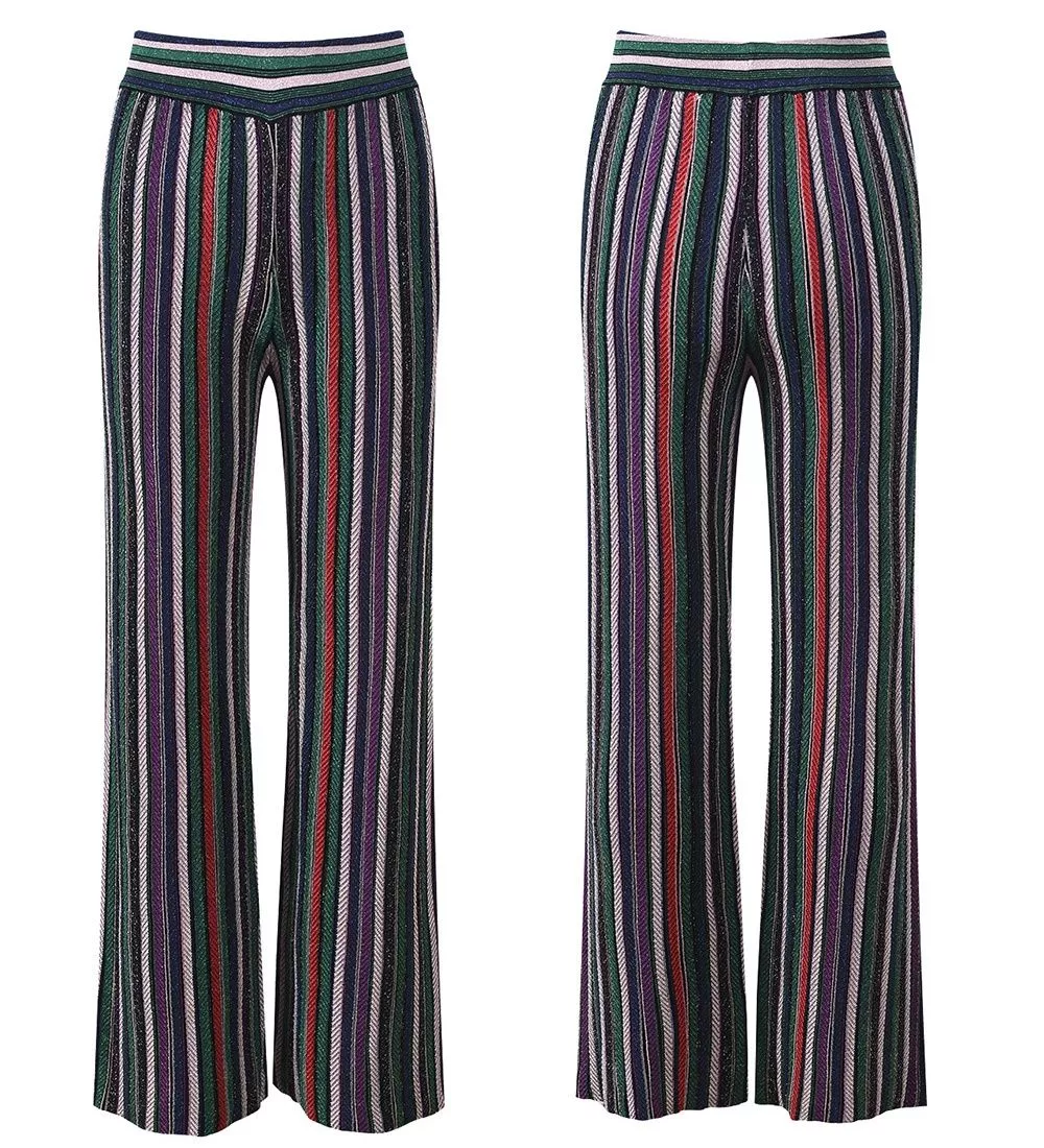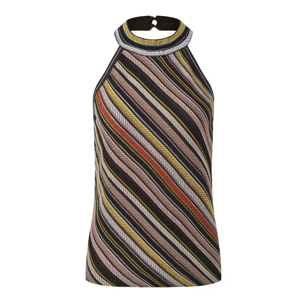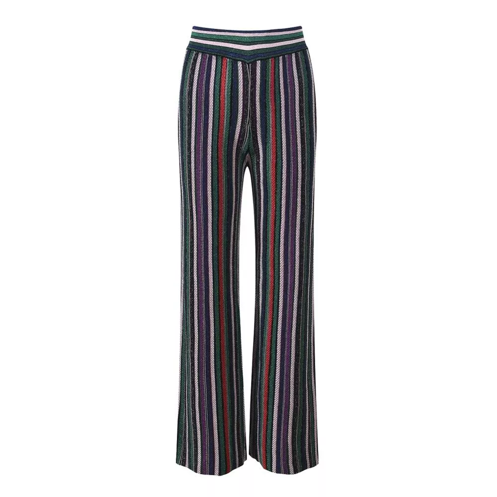 Completo donna composto da top con collo allacciato e pantaloni a gamba ampia, caratterizzato da una lavorazione a righe multicolore dal forte impatto visivo.