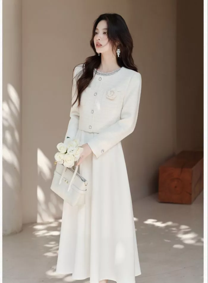 La giacca coordinata completa il set con un tocco sofisticato. La struttura compatta e il taglio corto bilanciano le proporzioni dell’abito lungo, creando un insieme elegante e ben definito. I dettagli decorativi frontali aggiungono carattere senza appesantire il look, mantenendo uno stile pulito e ricercato.