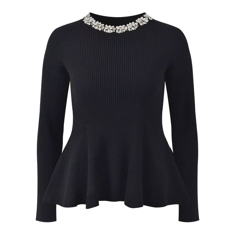 Il top presenta una linea aderente che valorizza il busto, con fondo leggermente svasato e raffinato dettaglio gioiello applicato sullo scollo, che dona luminosità al look.
