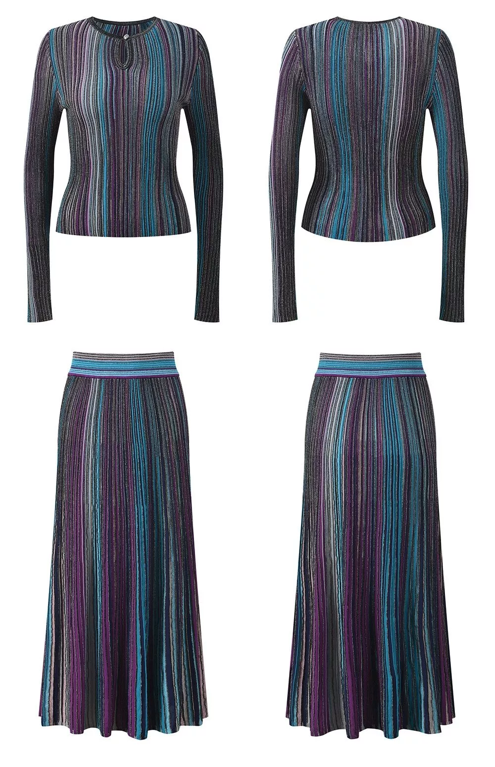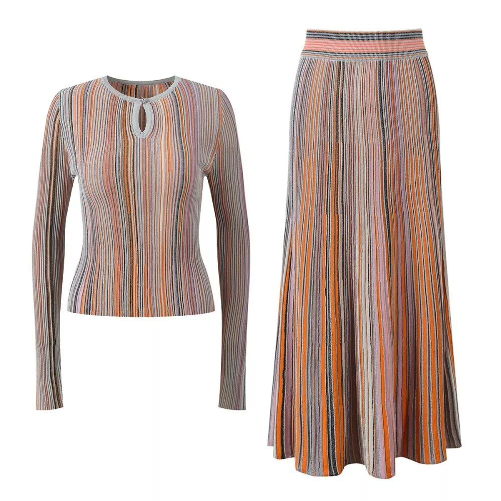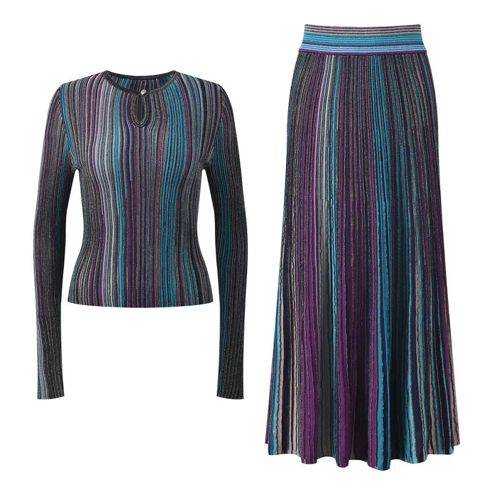 Set donna composto da top a maniche lunghe e gonna lunga coordinata, realizzato in tessuto a costine con righe verticali multicolor che slanciano visivamente la figura. Il top presenta una linea aderente con scollatura a goccia sul davanti, dettaglio femminile e discreto che valorizza il décolleté senza risultare eccessivo.