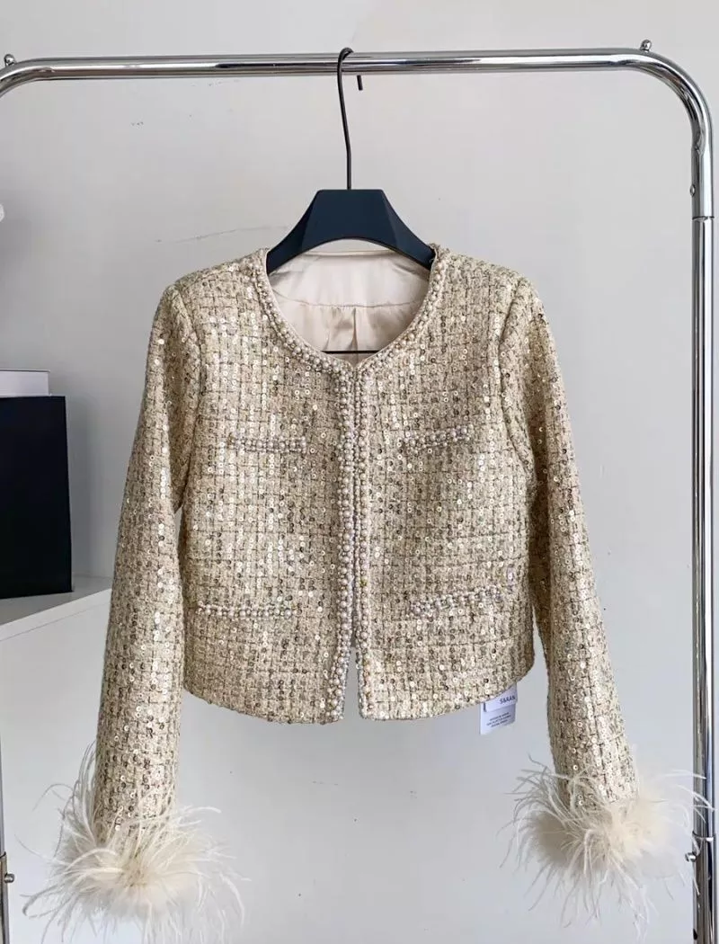 La giacca corta presenta una linea pulita e femminile, impreziosita da finiture decorative e dettagli piumati sui polsini, che aggiungono movimento e un tocco di ricercatezza. La gonna corta coordinata valorizza la silhouette mantenendo un’estetica armoniosa ed elegante, ideale per eventi serali, cerimonie o occasioni speciali.