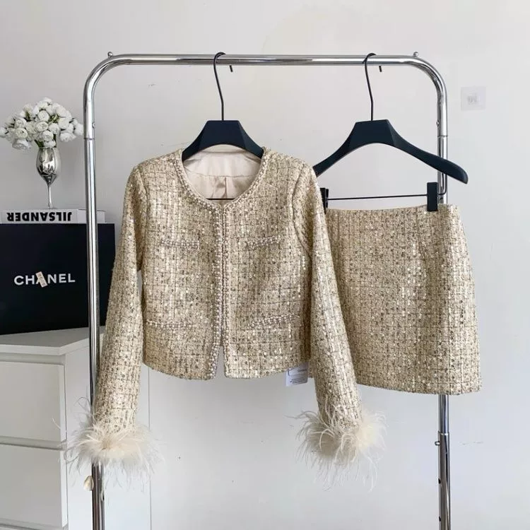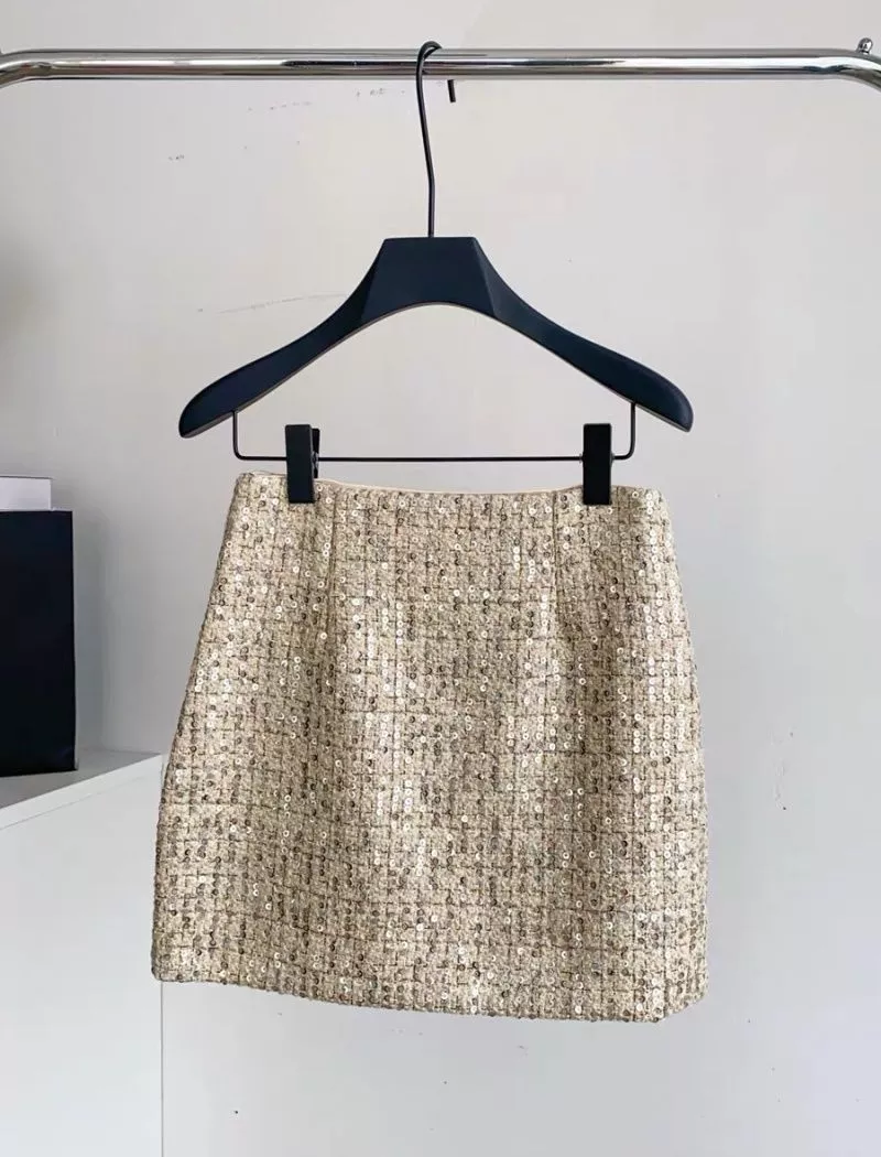 Set Donna Oro Elegante Giacca Corta Con Paillettes E Gonna Coordinata CF62020