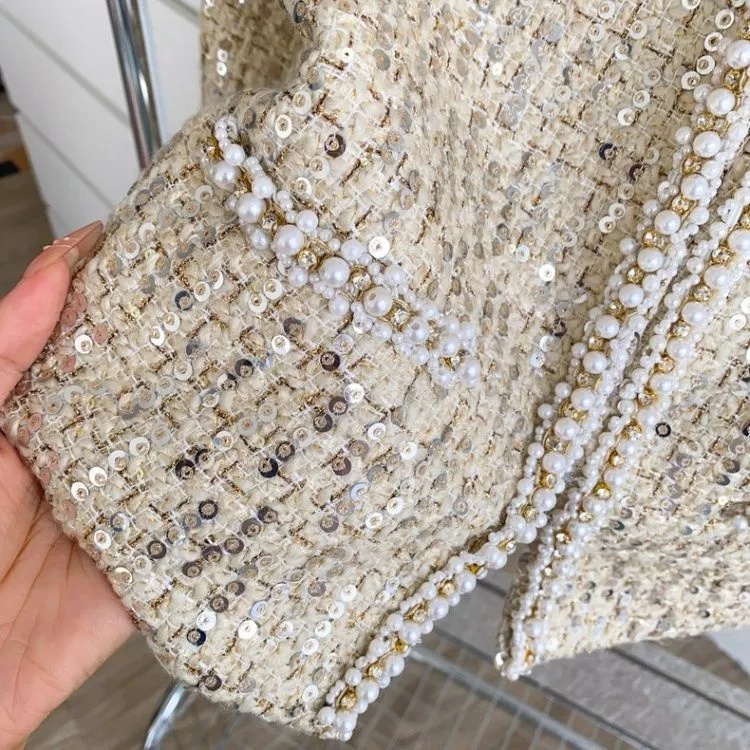 Set due pezzi da donna dallo stile elegante e luminoso, composto da giacca corta coordinata e gonna corta abbinata. Il completo si distingue per la lavorazione testurizzata arricchita da paillettes diffuse che creano un effetto brillante uniforme, donando al look un carattere raffinato e scenografico.