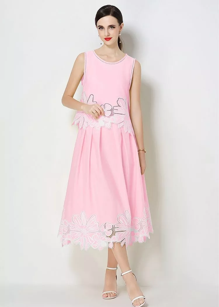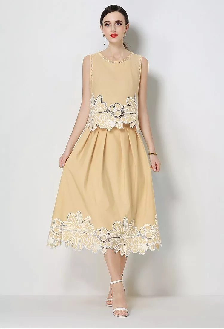 Completo due pezzi dal fascino couture composto da top ricamato coordinato e gonna midi ampia con lavorazione floreale traforata. La linea strutturata valorizza il punto vita mentre il ricamo sangallo dona pregio e leggerezza visiva. Un coordinato sofisticato ideale per cerimonie, eventi, party eleganti e occasioni speciali.